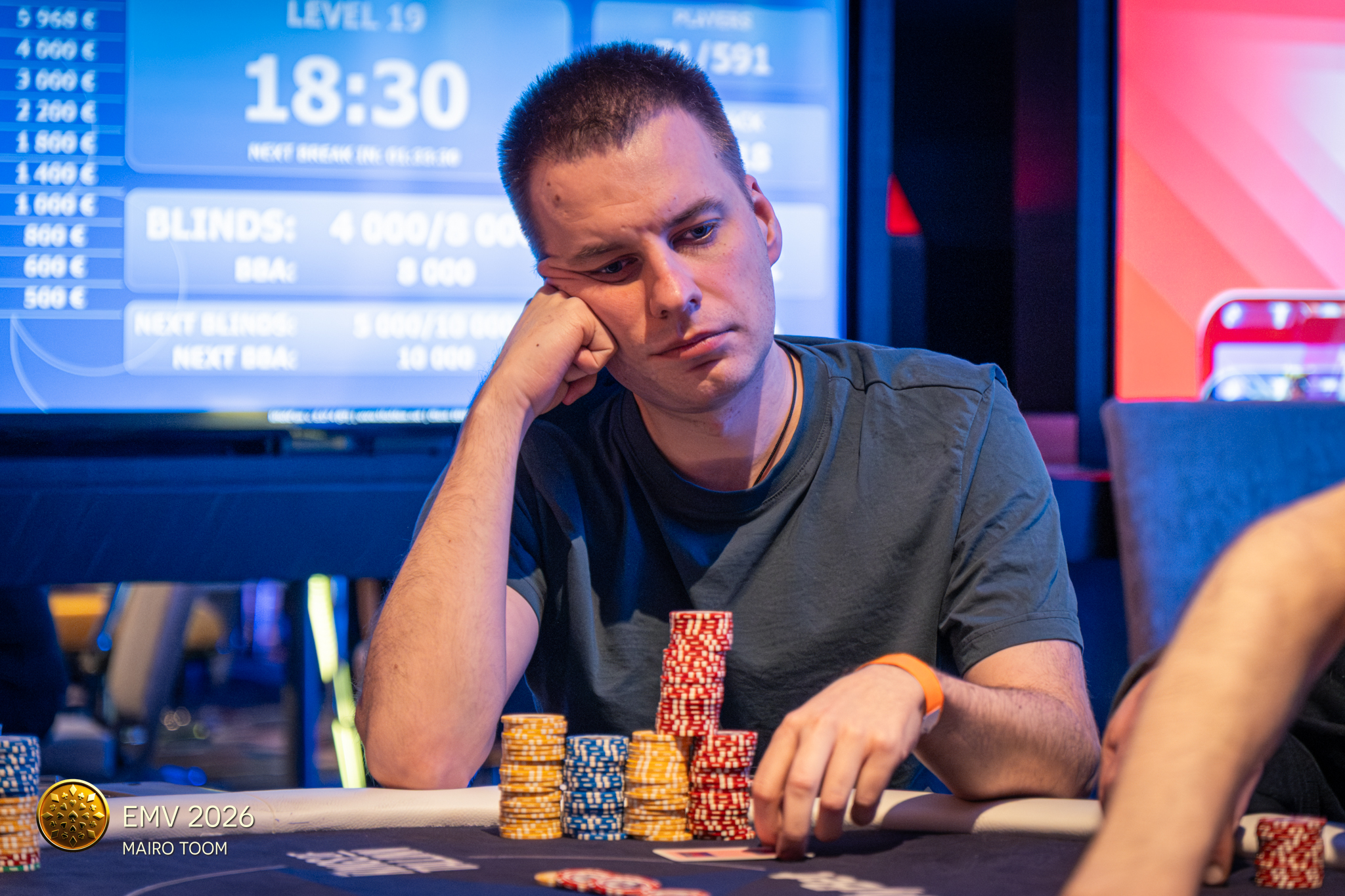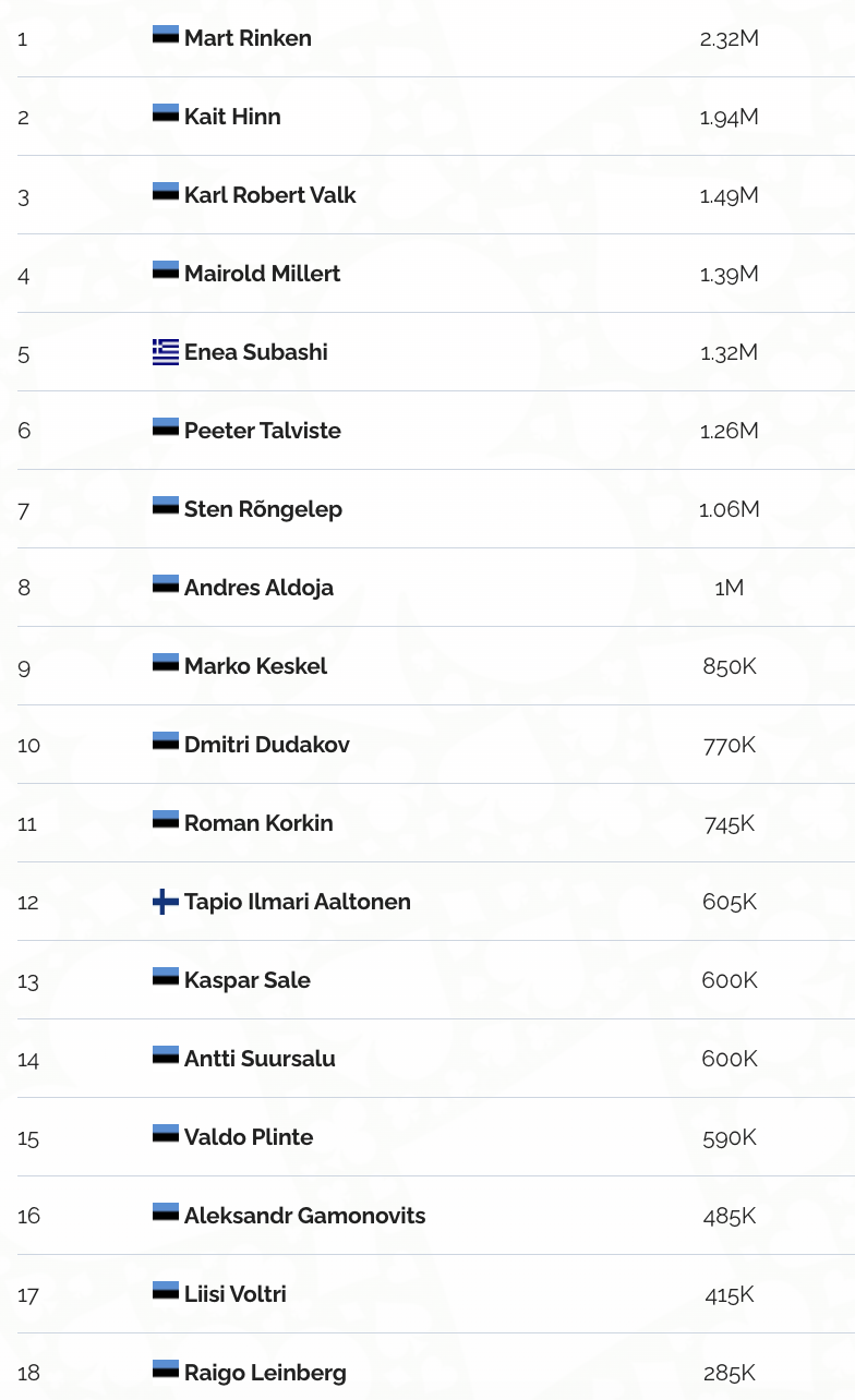 Esikohal on hetkel Aleksandr Gamonovits. Kõige väiksema stäkiga on finaalis aga Taavi Tamm. Alustame tasemelt 3500/7000/7000. Tasemed vältavad 25 minutit.