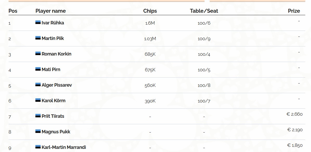 Kokkuvõtlikult on suurimate stäkkidega mängijad koondunud laua lõpuossa, mis loob olukorra kus näiteks keskmise stäckiga Mati Pirn on sisuliselt “sandwichis” ning liialt agressivselt ilmselt ei alusta. Lühikeste stäkkidega Magnus Pukk ja Karl-Martin Marrandi peavad varakult duublit otsima, sest oodata enam väga ei saa.