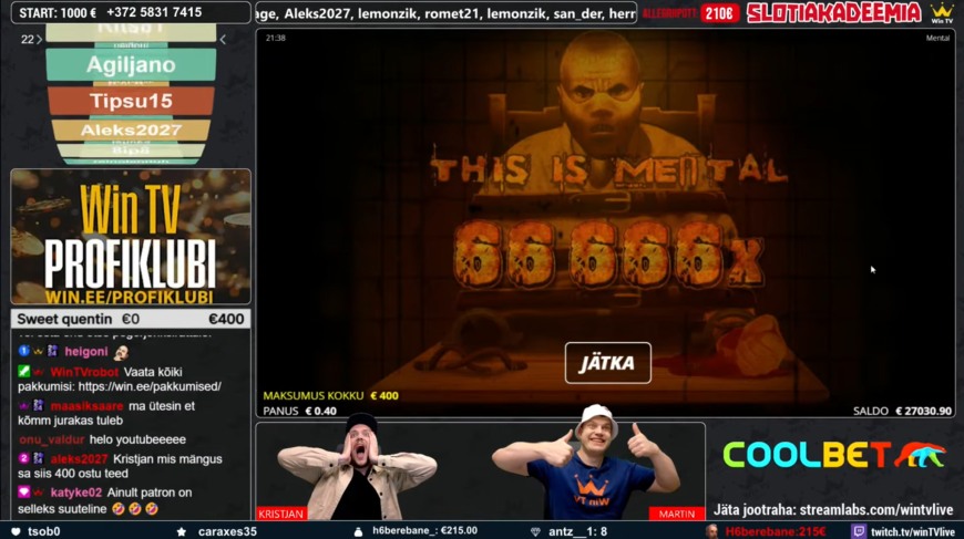 Win TV saatejuhid Kristjan Laas ja Martin Kõiv suutsid Slotiakadeemia saates võtta populaarses Mental mängus maksimaalse võidu kogusummas 26 664€